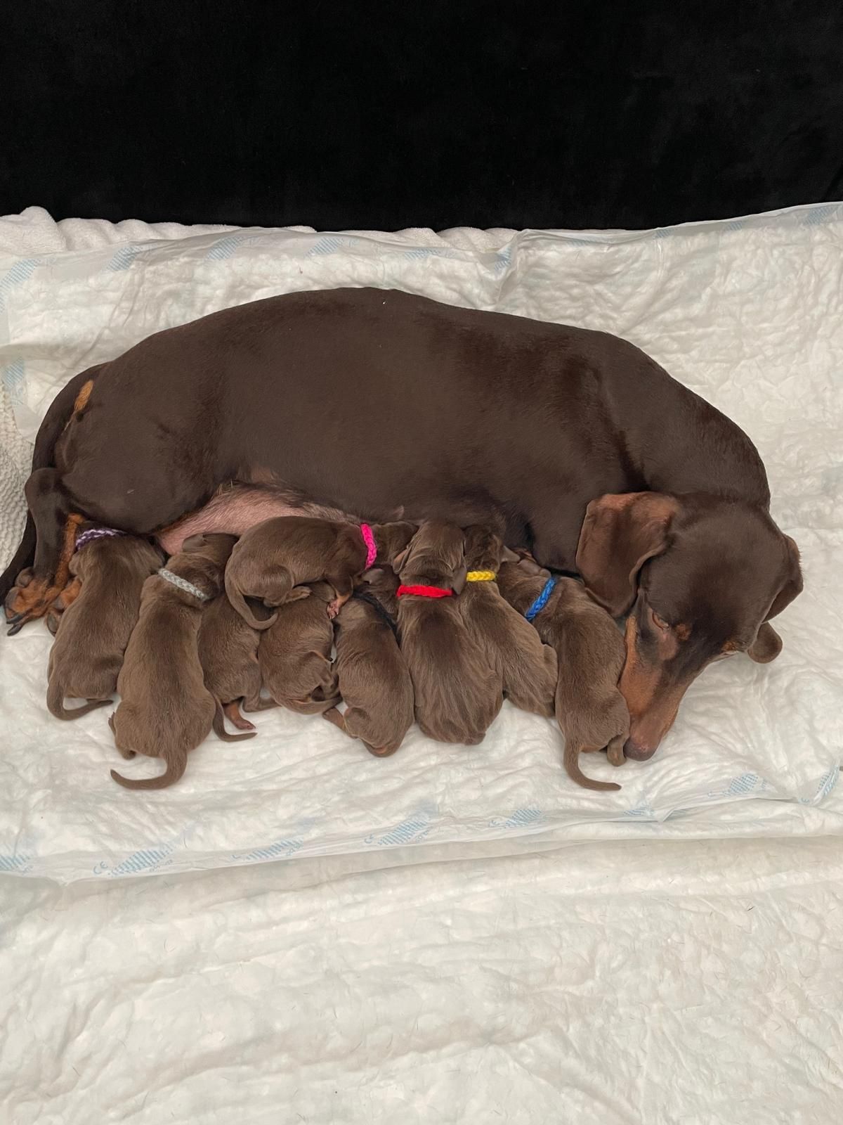 9 Welpen: fünf schwarz-rote Rüden, zwei schwarz-rote Hündinnen, zwei braun-rote Hündinnen